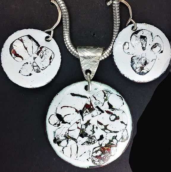 Enamel fusion white pendant and earrings.